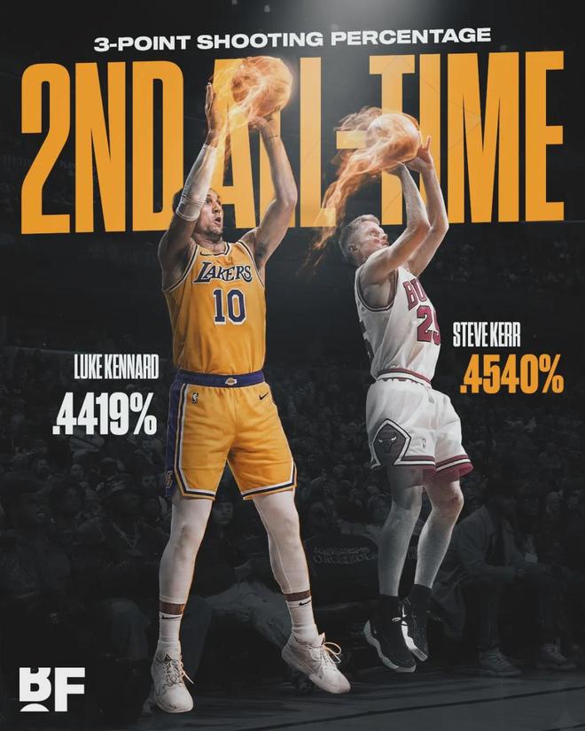 此外,肯纳德在湖人每次投篮出手能得到1.59分,这一数据在联盟所有后卫和锋线当中排第一。肯纳德在NBA打了9个赛季,只有2个赛季三分命中率低于四成,但从未低于过39%。肯纳德NBA生涯场均出手4.3记三分,命中率44.2%。